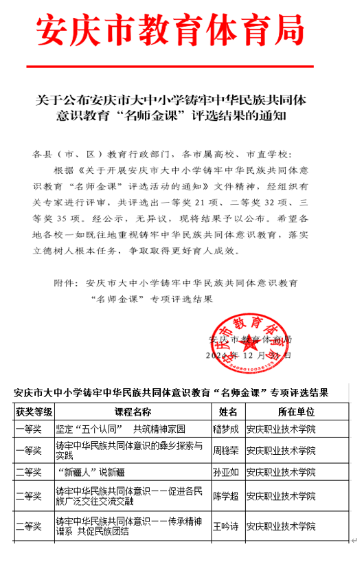 近日,由中共安庆市委高等教育委员会、安庆市教育体育局联合主办的安庆市大中小学铸牢中华民族共同体意识教育“名师金课”评选结果新鲜出炉。伟德官网五位思政课教师凭借扎实的理论功底、创新的教学设计和优秀的教学能力,取得优异成绩。嵇梦成、周稳荣老师获一等奖,孙亚如、陈学超和王吟诗老师获得二等奖,获奖情况在安庆市属院校名列前茅。
