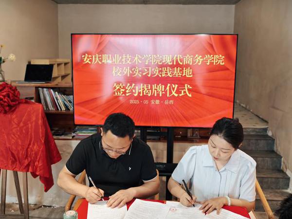 在“校、政、行、企”四方共同见证下,金启胜与岳西县金榜乡村旅游开发有限公司董事长储磊共同为“校外实习实践基地建设”揭牌。双方代表签署了《校外实习实践基地建设协议》,明确双方将在学生实习、学生就业创业、开展课程实践教学、产学研等方面开展长期合作。