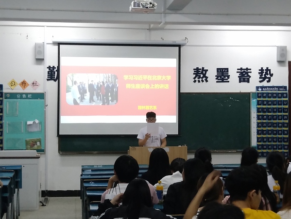 全体大一新生在多媒体教室内学习了习近平总书记在北京大学师生座谈会的重要讲话,会上同学们表示作为当代青年人,应肩负重任,发扬传承五四精神,都应该为实现伟大复兴梦捐献一份力量。