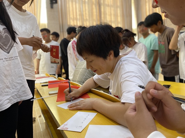 在寄语华夏环节,同学们邀请李进恩和许咏梅为自己在明信片上的寄语,并合影留念。