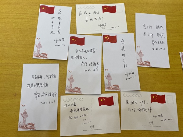 在寄语华夏环节,同学们邀请李进恩和许咏梅为自己在明信片上的寄语,并合影留念。