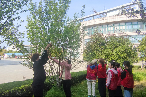 校后勤保障处余碧霞老师在活动开始前为同学们详细讲解了关于树枝修剪的相关知识及如何正确使用修剪工具,并予以示范。师生携手对梅花树上枯枝萎叶、老枝病梢、交叉枝等亚健康枝条进行清理。