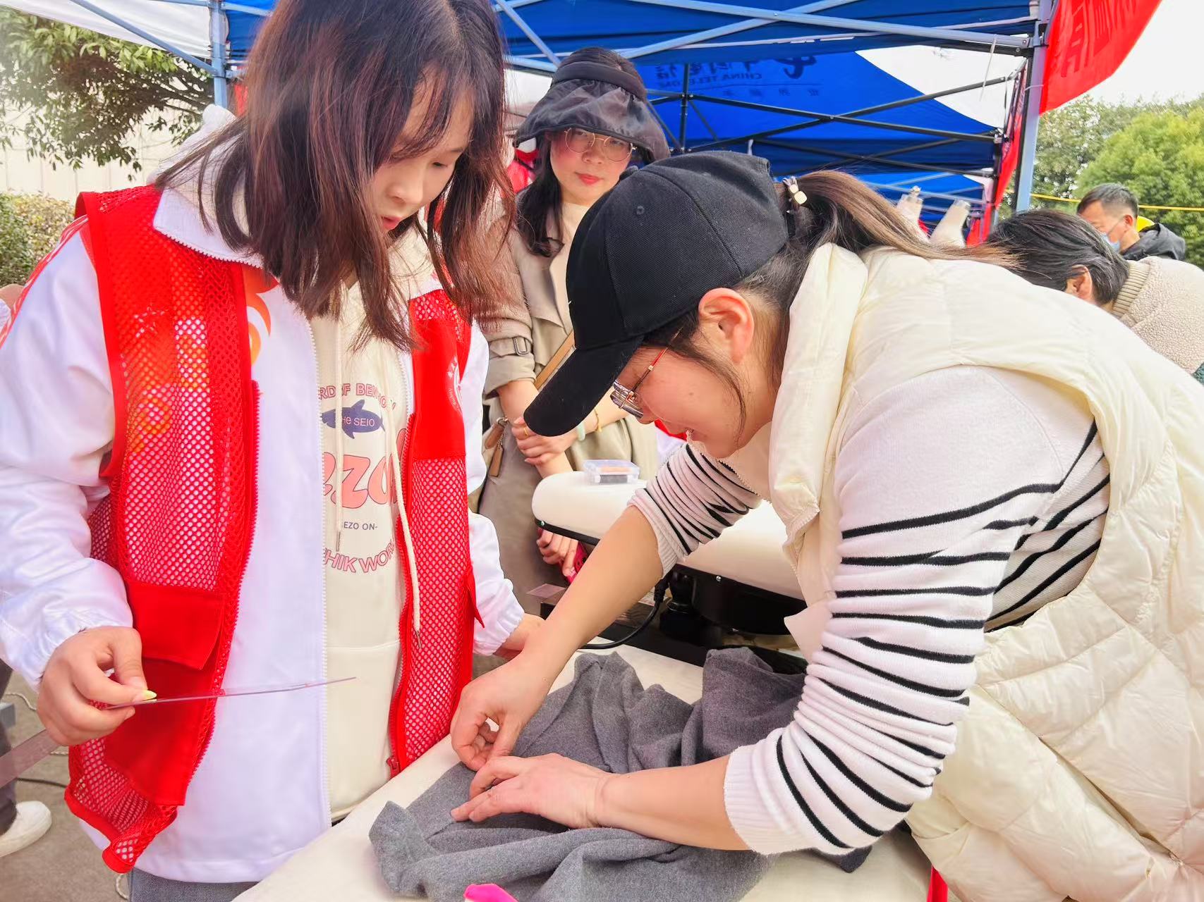 活动现场,服装团队党员教师带领服装设计与工艺专业学生,携带缝纫机、熨烫机等专业设备,为市民提供衣物缝补、熨烫等便民服务。学生们娴熟地穿针引线、调整熨斗温度,细致处理市民送来的衣物。从修补开线的校服到熨平褶皱的西装,志愿者们用专业技能让一件件旧衣焕发“新生”。市民张奶奶拿着缝补好的裤脚连连称赞:“这些孩子技术好、态度更暖心,真是把服务送到了我们心坎上!”