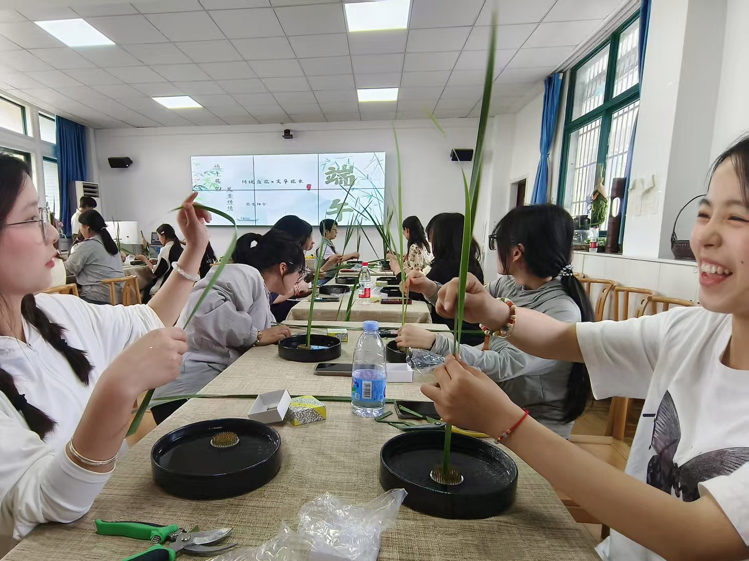 活动现场,花艺爱好者协会指导老师徐基艳和师生一起回顾端午节赛龙舟、包粽子、做香囊等传统习俗,讲解了中国传统插花技法六要素。在协会会长荣晶晶同学的指导下,师生们选用菖蒲、艾草、月季等端午时令花材,以陶瓷浅盘为器皿,通过错落有致的插制手法,创作出象征五福临门的中国传统盘花作品。