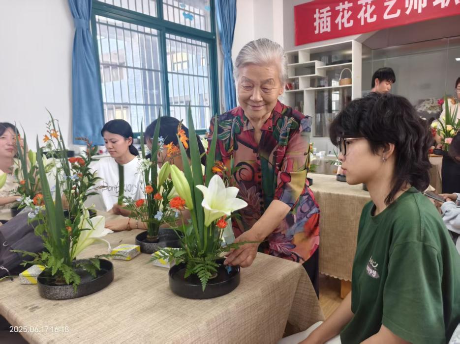随后,付玉兰教授对整场活动进行了总结,高度肯定了同学们展现的热情与潜力。她特别寄语现场学生:“非遗的生命力在于传承中创新。希望你们能成为徽派插花艺术的新火种,在理解其深厚底蕴的基础上,勇于探索,让中国传统插花技艺在新时代绽放更璀璨的光芒。”