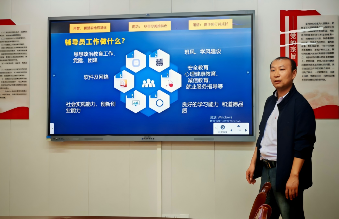 活动中,学生工作负责人为受聘担任指导教师的辅导员颁发了聘书。一纸聘书,既是一份荣誉与信任,更是一份沉甸甸的责任与担当,象征着学院学生工作优良传统的接续与传承。在师徒结对这一温馨环节中,新老辅导员一一结对,新辅导员向各自的“导师”恭敬致意。简单的仪式背后,是新辅导员虚心求教的决心,也是老辅导员倾囊相授的承诺。仪式结束后,辅导员余德龙老师通过精心准备的课件和新生辅导员分享了近期重点工作之一困难认定工作的注意事项及自己的班级管理工作经验。在场的辅导员均表示受益匪浅。