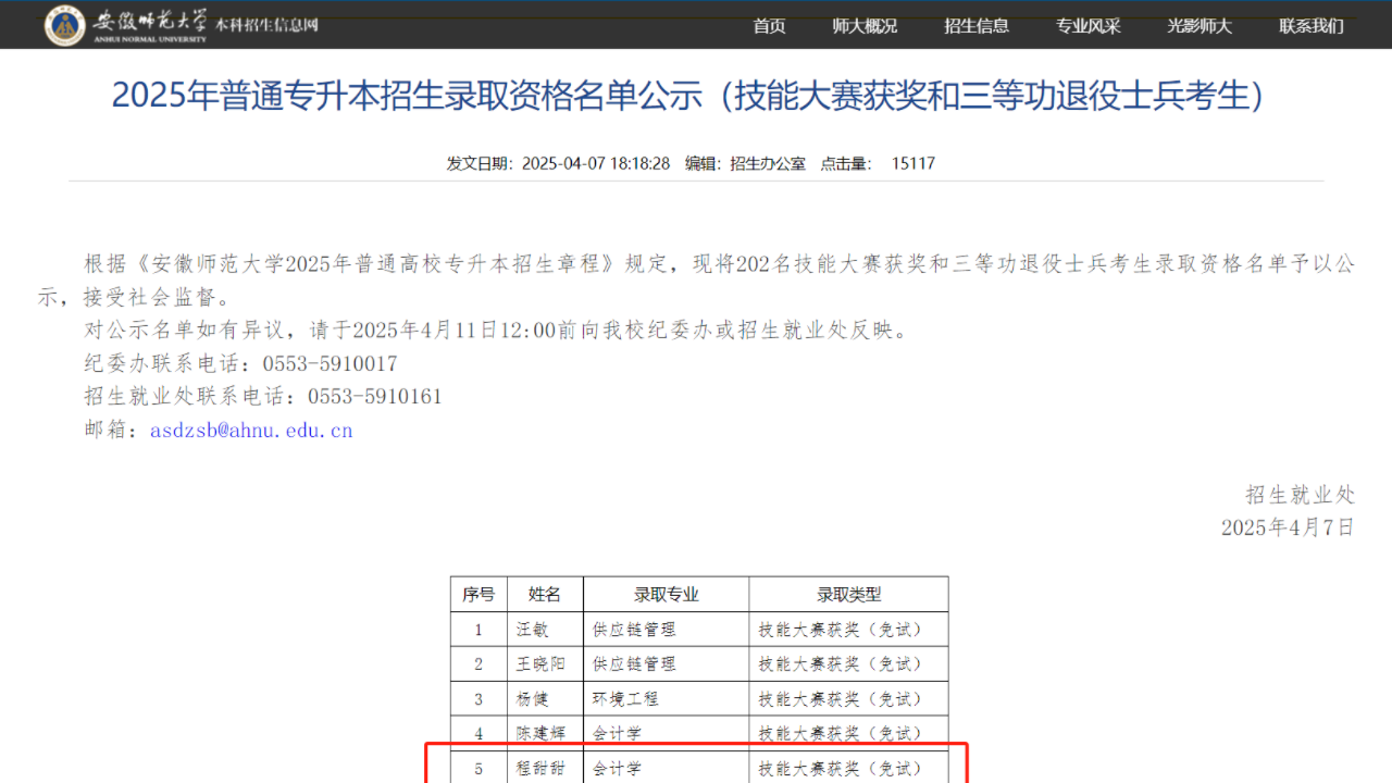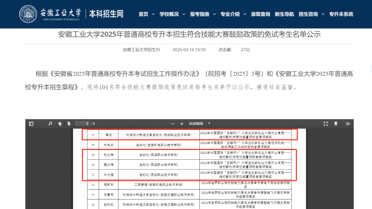 近日获悉,伟德官网机电工程学院、现代商务学院25届毕业生牛永强、常波、张之瑞、魏文博、程甜甜已通过2025年普高“专升本”免试直录资格申请,提前被安徽师范大学、安徽工业大学2所本科院校录取。
